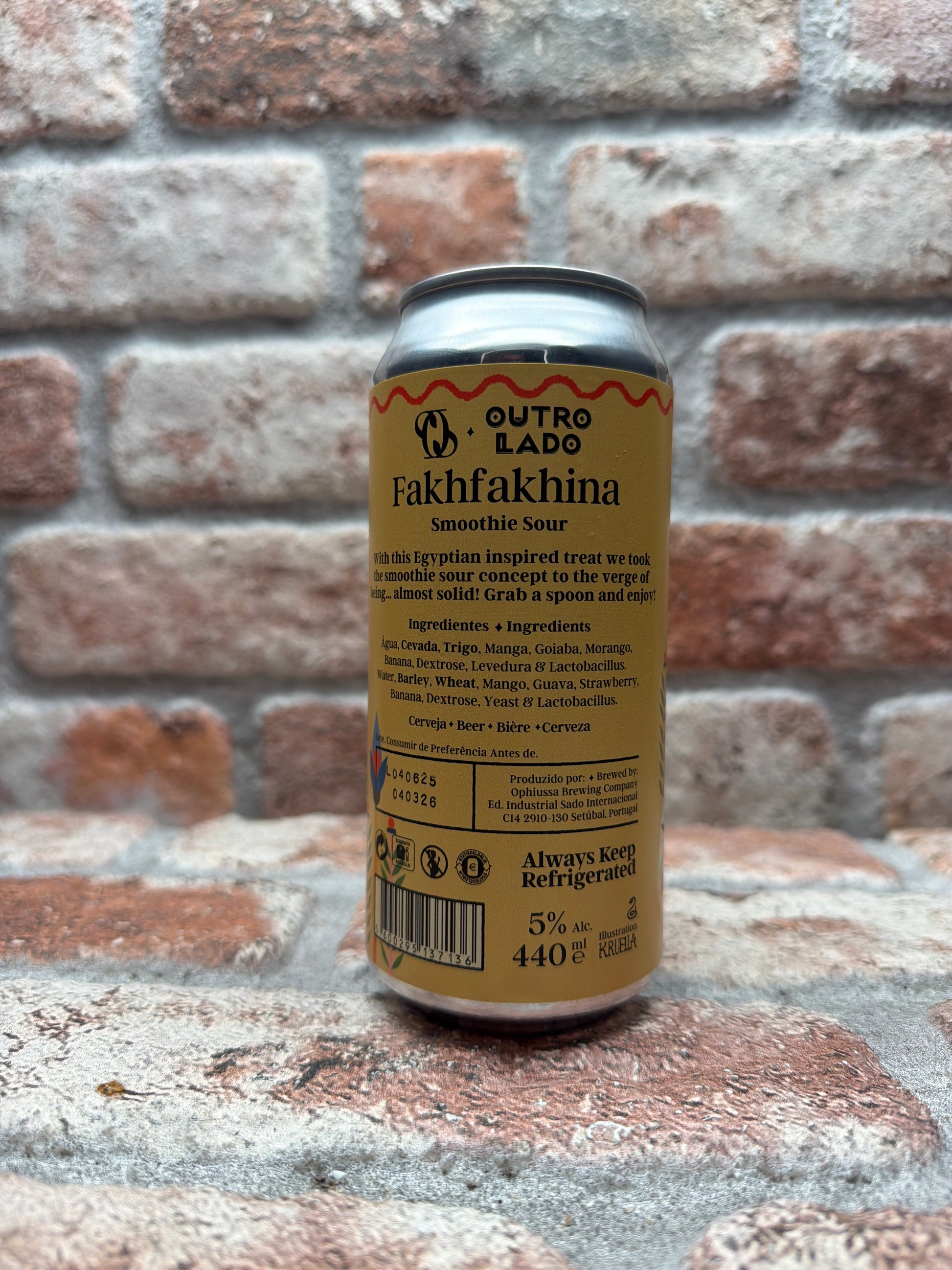 Fakhfakhina is een Smoothie Sour, gebrouwen in samenwerking met Outro Lado, een van onze favoriete ambachtelijke bierbars in Lissabon. Geïnspireerd door de gelijknamige traditionele Egyptische fruitcocktail, is het een tropische explosie in een glas. Absurde hoeveelheden guave, mango, aardbei en banaan maken dit bier ongelooflijk romig en dik, zo dik dat je het bijna met een lepel zou kunnen drinken. De balans tussen de verfrissende zuurgraad en de natuurlijke zoetheid van het fruit neemt je rechtstreeks mee naar de bruisende markten van Caïro, waar de inspiratie voor dit recept werd geboren. Meer dan alleen een biertje, Fakhfakhina is een gedurfde reis door exotische smaken, gemaakt om te verrassen, op te frissen en te verleiden!