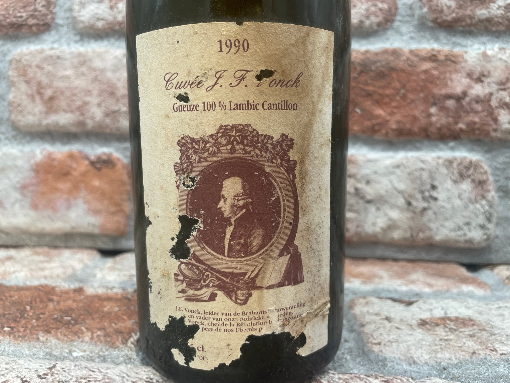A two-year-old lambic without sugar added for the second fermentation. The carbonation is too strong to be considered a lambic and not enough for a gueuze, a hybrid beer. Brewed in 90, bottled in 92 and as a tribute to Jean-François Vonck, a Belgian revolutionary.